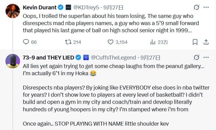 Durant commented on this: "Oh, I teased this super fan and said that his team lost. It was the guy who was crazy disrespectful to the names of NBA players, a 5-foot-9 (1-meter-75) small forward who finished his last game at the 1999 high school graduation party..."
