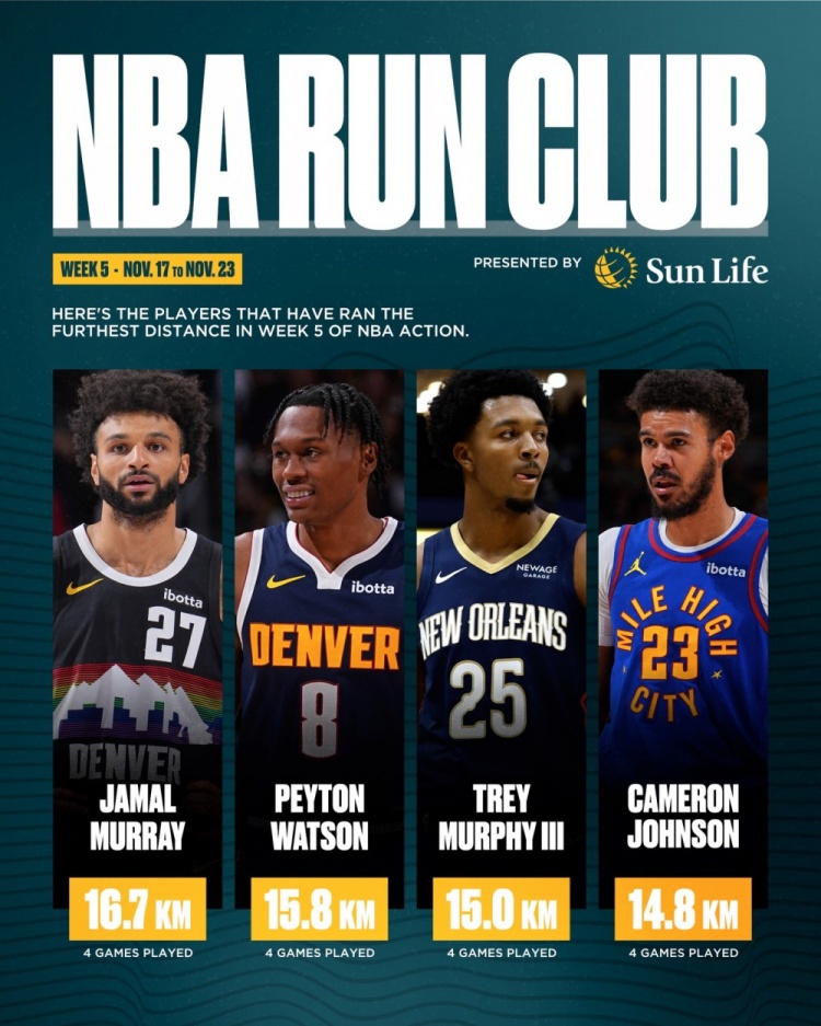 Three Nuggets are on the list! Distance run in the 5th week of the season: Murray ranked first with 16.7km, Murphy ranked third with 15km