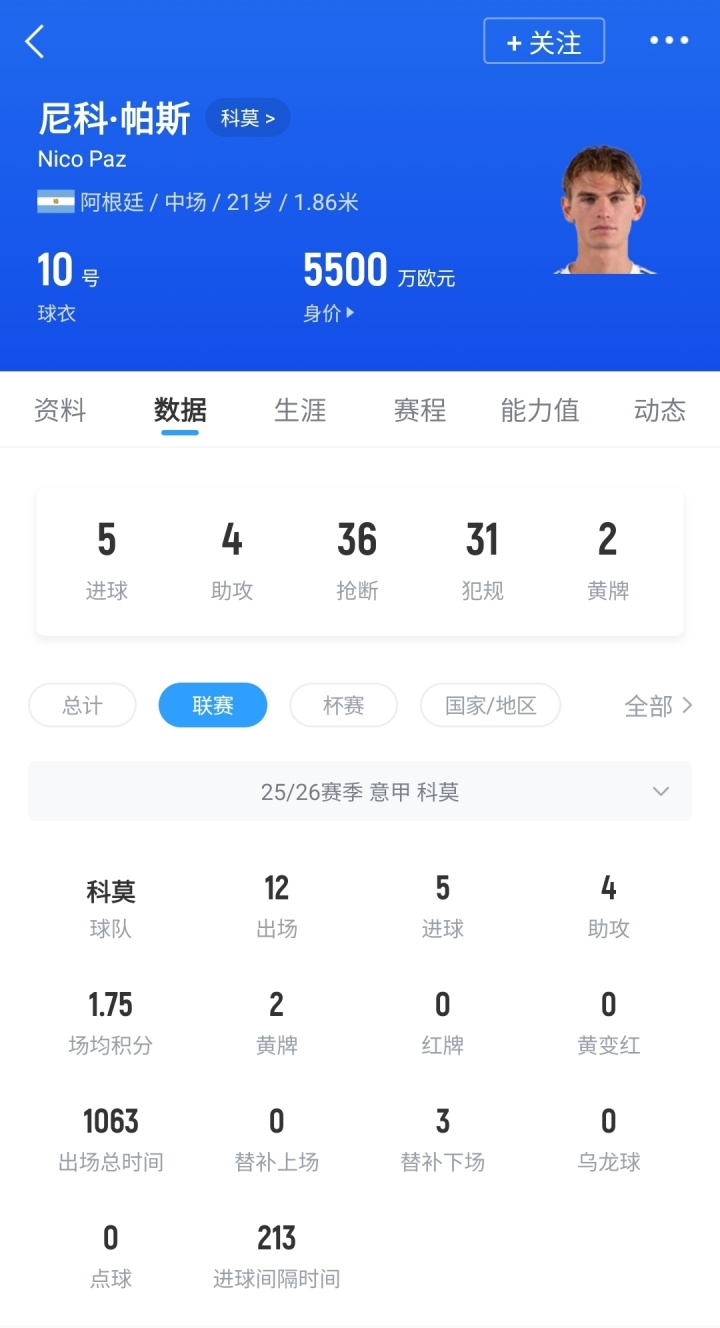 Romano said: As revealed a few months ago, Real Madrid plans to repurchase Paz as the first signing in 2026. It is understood that the buy-back clause does not come into effect in January and Como hopes to keep him until the summer.