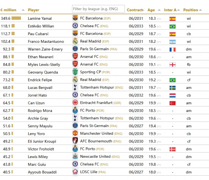 Today, CIES, the authoritative football statistics agency, counted the players who have not yet reached the age of 20 but have the highest estimated transfer fees. Four of them have estimated transfer fees of more than 100 million euros (including additional terms and 100% ownership). Yamal 350 million euros, leading the fault!