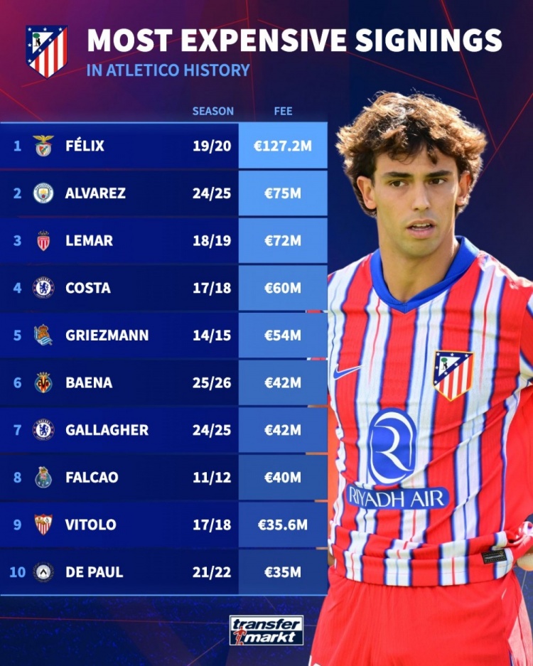 List of the most expensive signings in Atletico Madrid history: Felix leads the list with 127.2 million euros, followed by Little Spider with 75 million euros