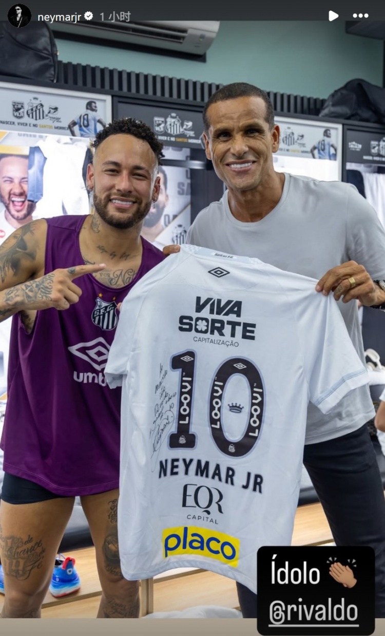 In this game, Neymar came off the bench to usher in his comeback. After the game, Neymar also posted a photo with the Brazilian star Rivaldo on social media and presented him with a signed jersey. The caption read: "Idol Rivaldo!"