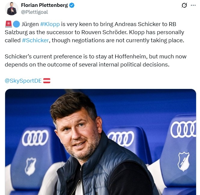 Reporter Florian Plettenberg reported that Red Bull global football director Klopp is very eager to introduce Hoffenheim director Schickel to Red Bull Salzburg to replace Schroeder.