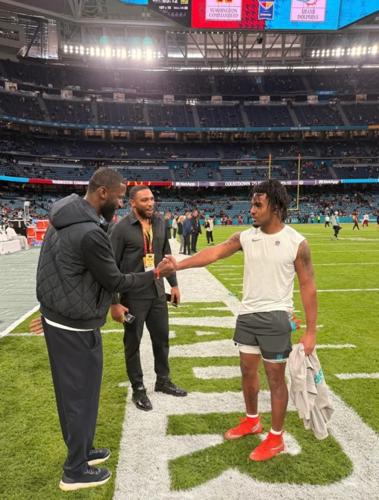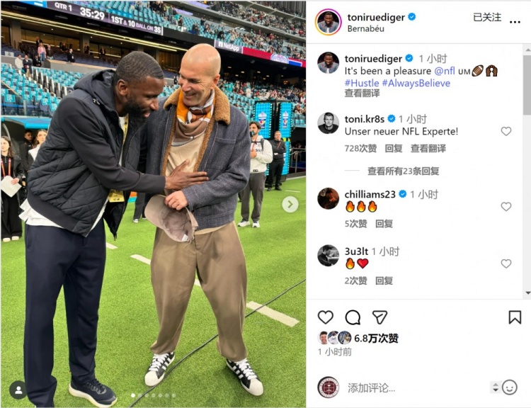 The NFL Spanish game was held at the Santiago Bernabéu Stadium last night. The Miami Dolphins defeated the Washington Commanders 16-13. Rudiger was invited to watch the game live and was invited to the commentary box. He posted photos on social media, with Zidane in the photo.