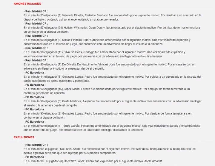 In addition, Ferran, Balde, Fermin, Rodrigo and Militao received yellow cards for still confronting their opponents on the field after the game.