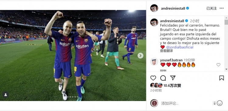 Alba will retire after the end of this season, and his old teammate Iniesta posted a message to him.